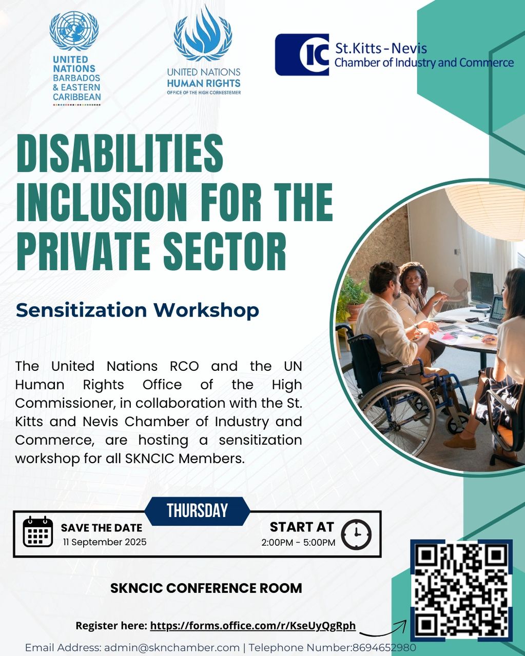 Join the United Nations RCO and the UN Human Rights Office of the High Commission at the SKNCIC's Conference Room for a Sensitization Workshop on "Disabilities Inclusion for the Private Sector" on September 11th 2025.